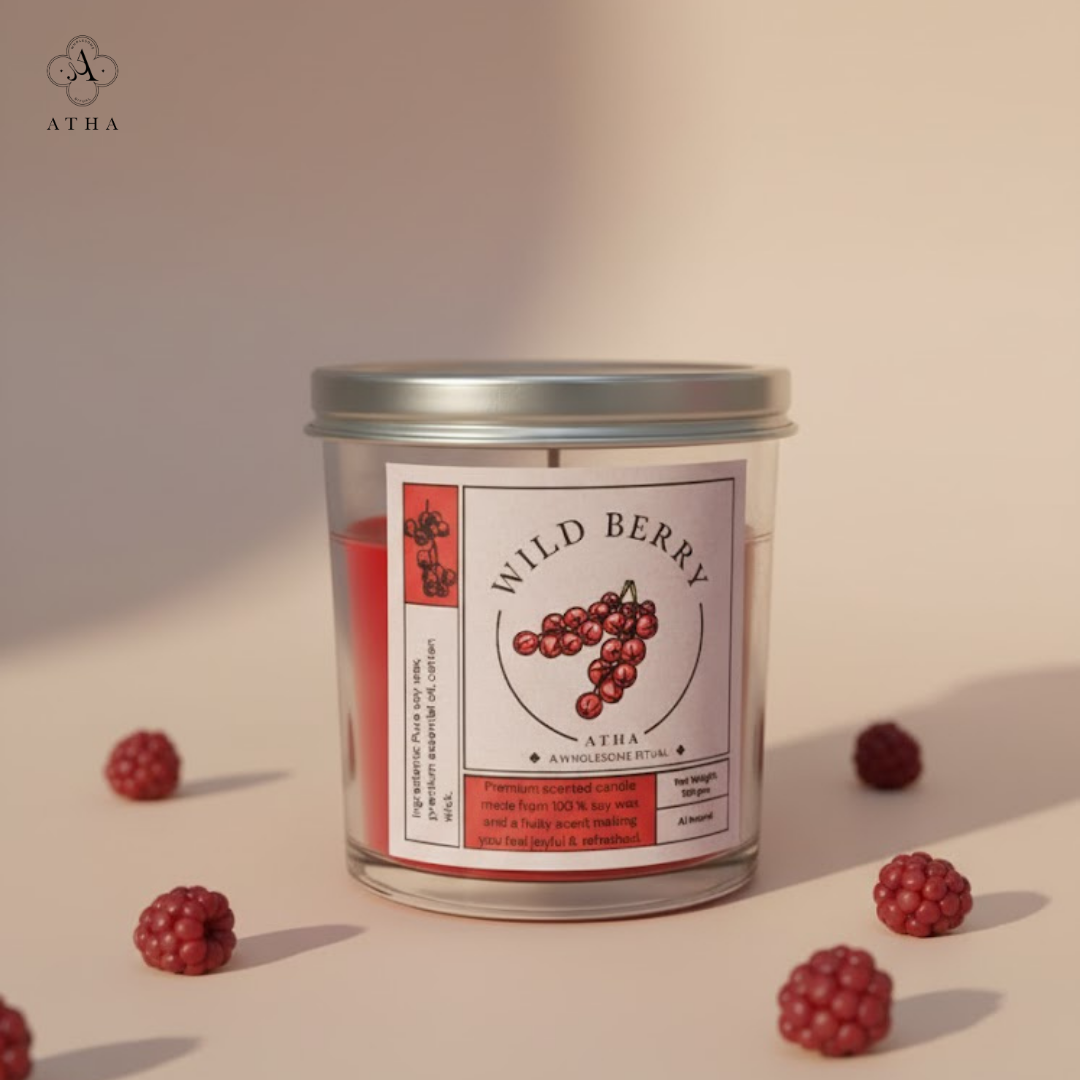 Indulge in the juicy aroma of wild berries with Atha’s soy wax candle—hand-poured in a chic glass jar for a calming and fragrant ambiance.